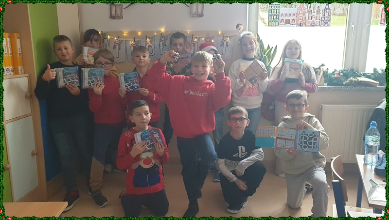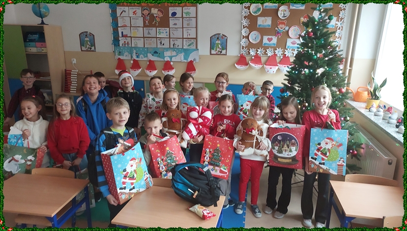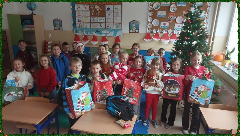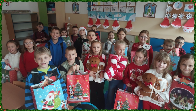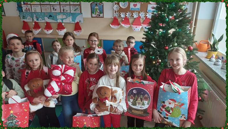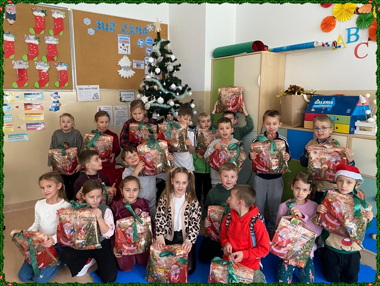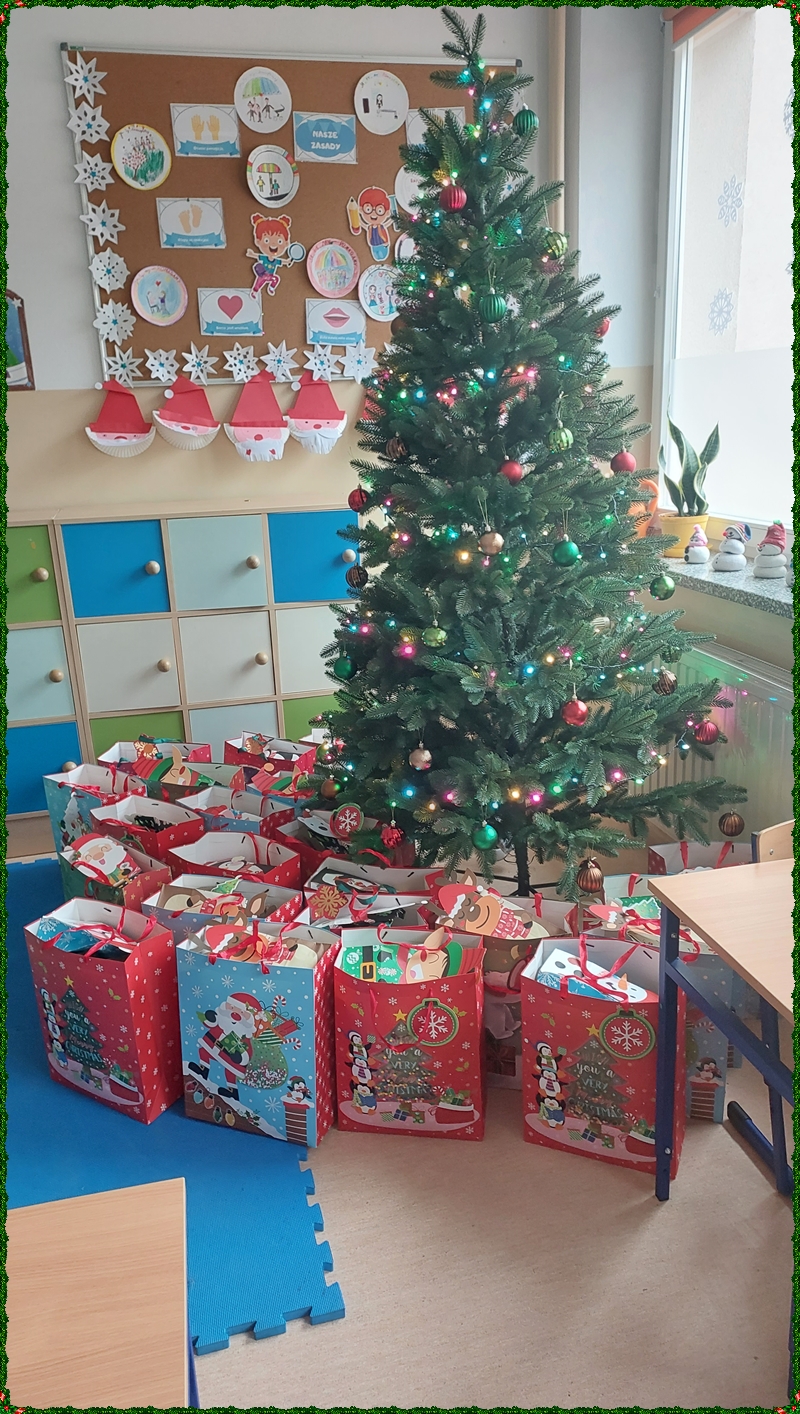 Po powrocie do szkoły na najmłodszych czekała kolejna niespodzianka. Kiedy tylko weszli do swoich sal, ich wzrok od razu przyciągnęła pięknie przystrojona choinka, pod którą… ukryły się prezenty! Okazało się, że Święty Mikołaj nie zapomniał o naszych dzielnych uczniach i zostawił dla każdego drobny upominek. Otwieraniu paczek towarzyszyła ogromna radość, ciekawość oraz mnóstwo dziecięcych uśmiechów.