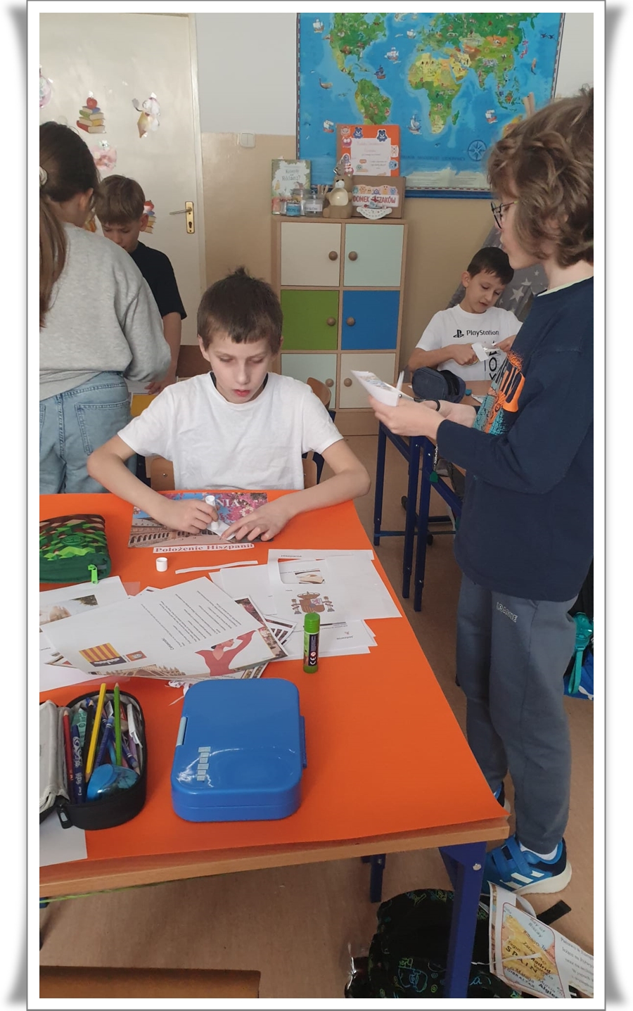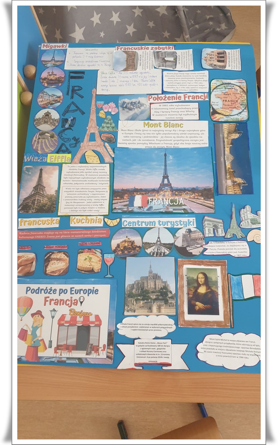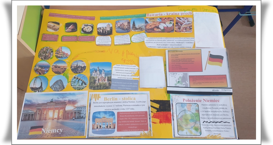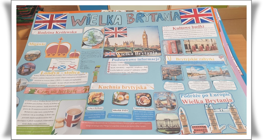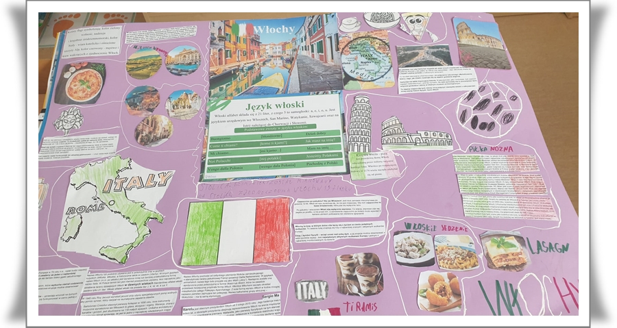 Szczególną częścią projektu było poznawanie wybranych krajów europejskich. Plakaty przygotowane przez uczniów dotyczyły Włoch, Francji, Hiszpanii, Wielkiej Brytanii oraz Niemiec. Dzieci przedstawiały na nich charakterystyczne symbole państw, takie jak zabytki, flagi, tradycyjne potrawy, stroje oraz ciekawostki kulturowe. Podczas pracy uczniowie korzystali z notatek, które przygotowali na zajęciach komputerowych oraz w domu. Prace wyróżniały się dużą pomysłowością, starannością wykonania oraz bogactwem kolorów.